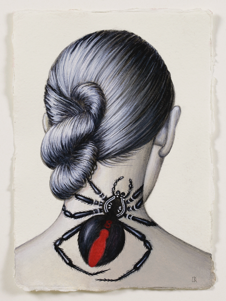 Redback Spider tattooed woman, pigmented drawing ink and gouache, 21 x 15 cm